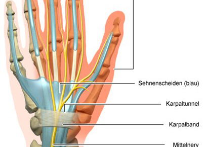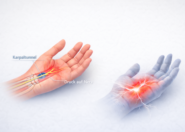 Nächtliche oder morgendliche Schmerzen in der Hand oder Arm bzw. Missempfindungen in der Hand und den Fingern können Ausdruck eines Karpaltunnel-Syndroms sein. Hierbei handelt es sich um eine Kompression eines Nerven am Durchtritt durch den Handgelenkstunnel, der durch die Handwurzelknochen und das straffe Handgelenksband begrenzt wird. Durch diesen physiologischen Engpass zieht der Nervus medianus zusammen mit den Fingerbeugesehnen.